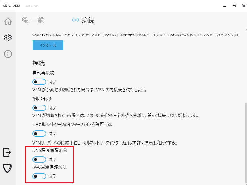2023年09月05日にリリースされたWindows版MillenVPN専用アプリv2.3.0.0について、リーク(漏洩)防止機能をOFFにする設定が追加され任意に変更できるようになりました。