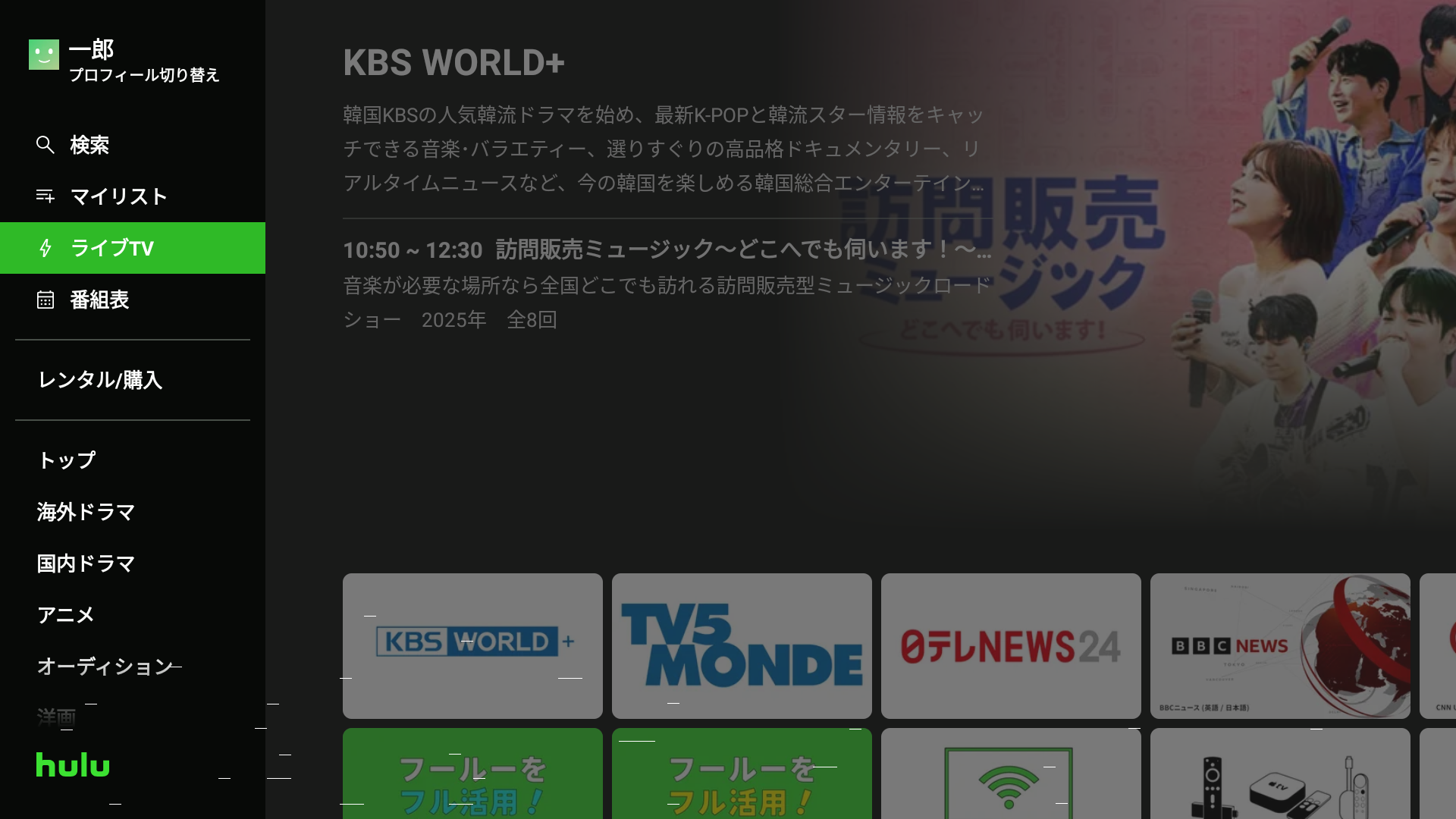 一例として、Fire TV Cubeで契約済の動画配信サービス「Hulu(フールー)」の場合でご説明します。