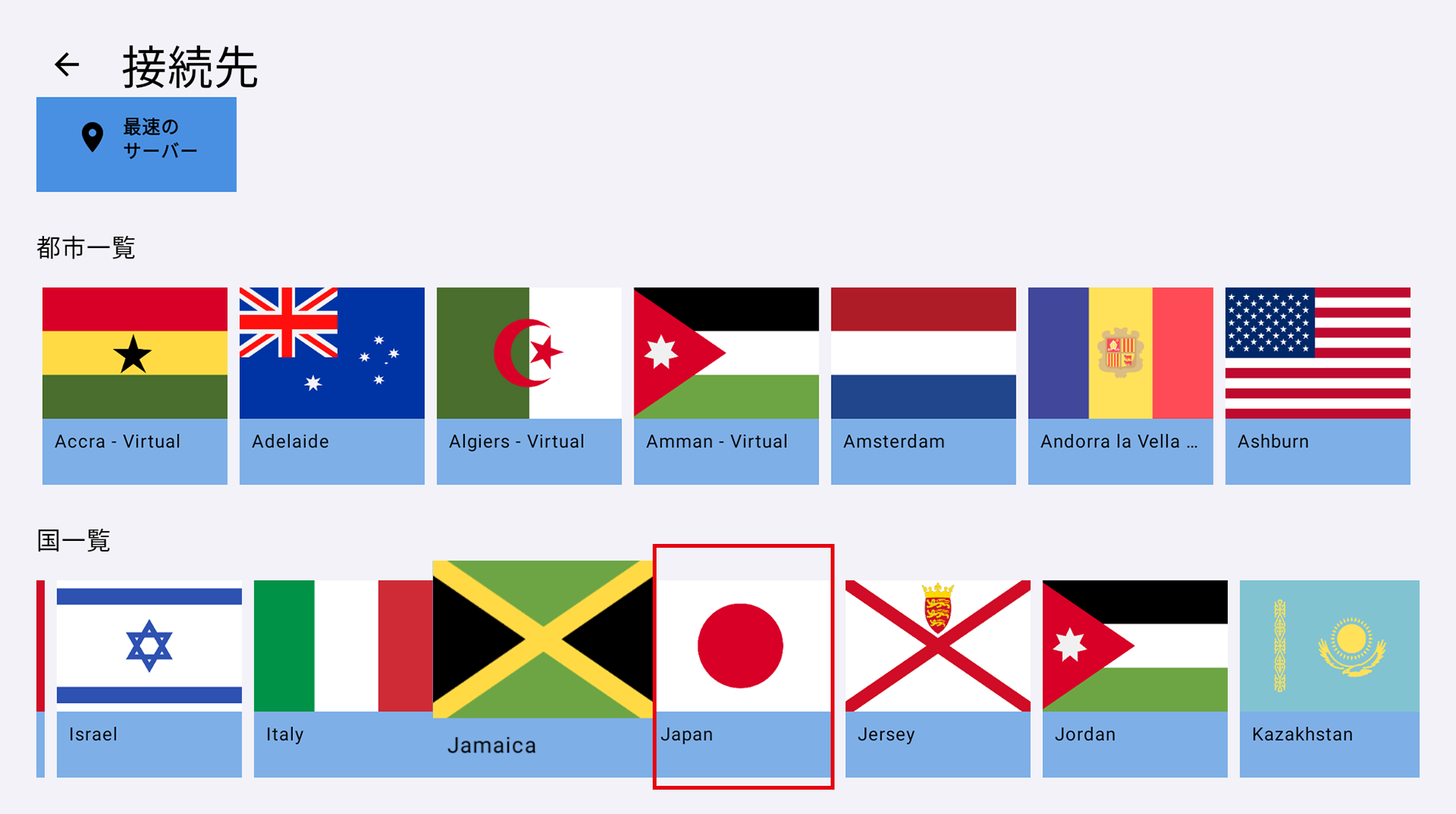 (3)接続先サーバーの国・地域名を選択する